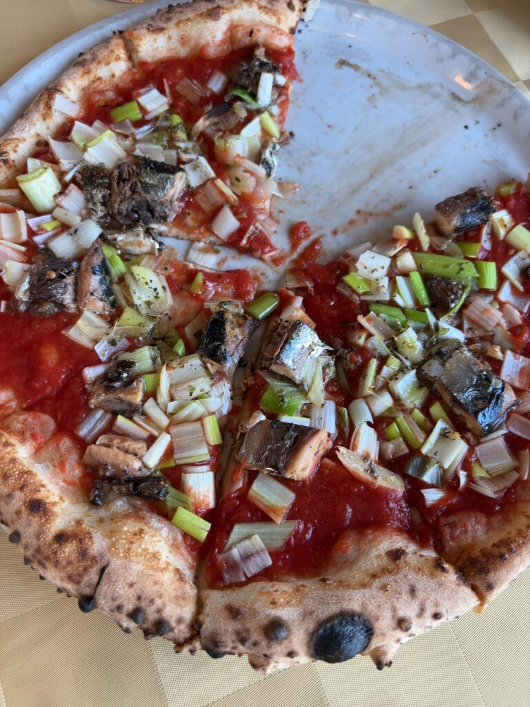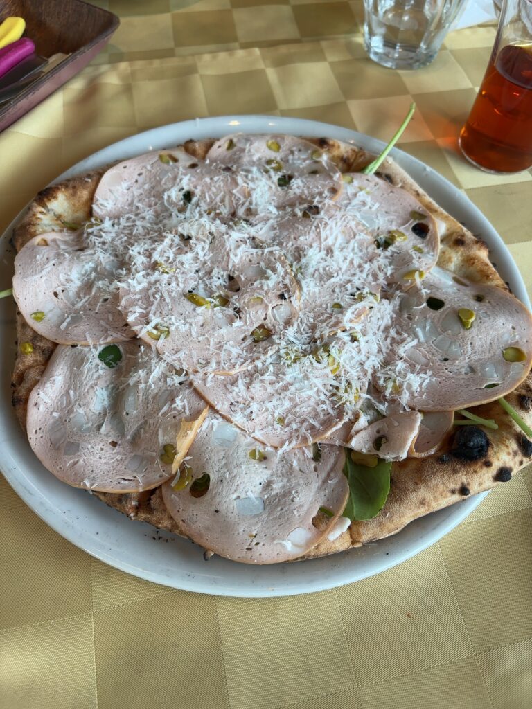 このピザのモルタデッラ(イタリア・ボローニャの伝統的ソーセージ)はピスタチオと油のうまみがすごいです。