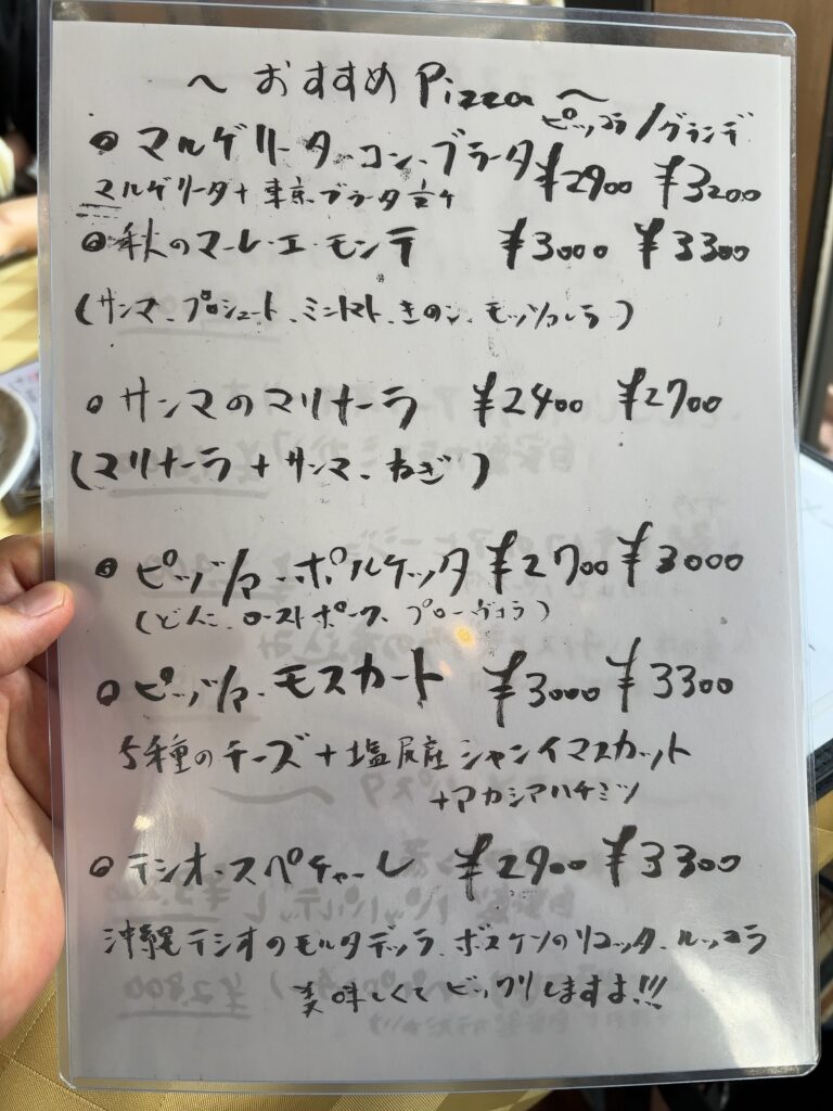 ジンガラには何度か行っていますが、今回は王道ではなく季節のおすすめピザを2枚注文しました!