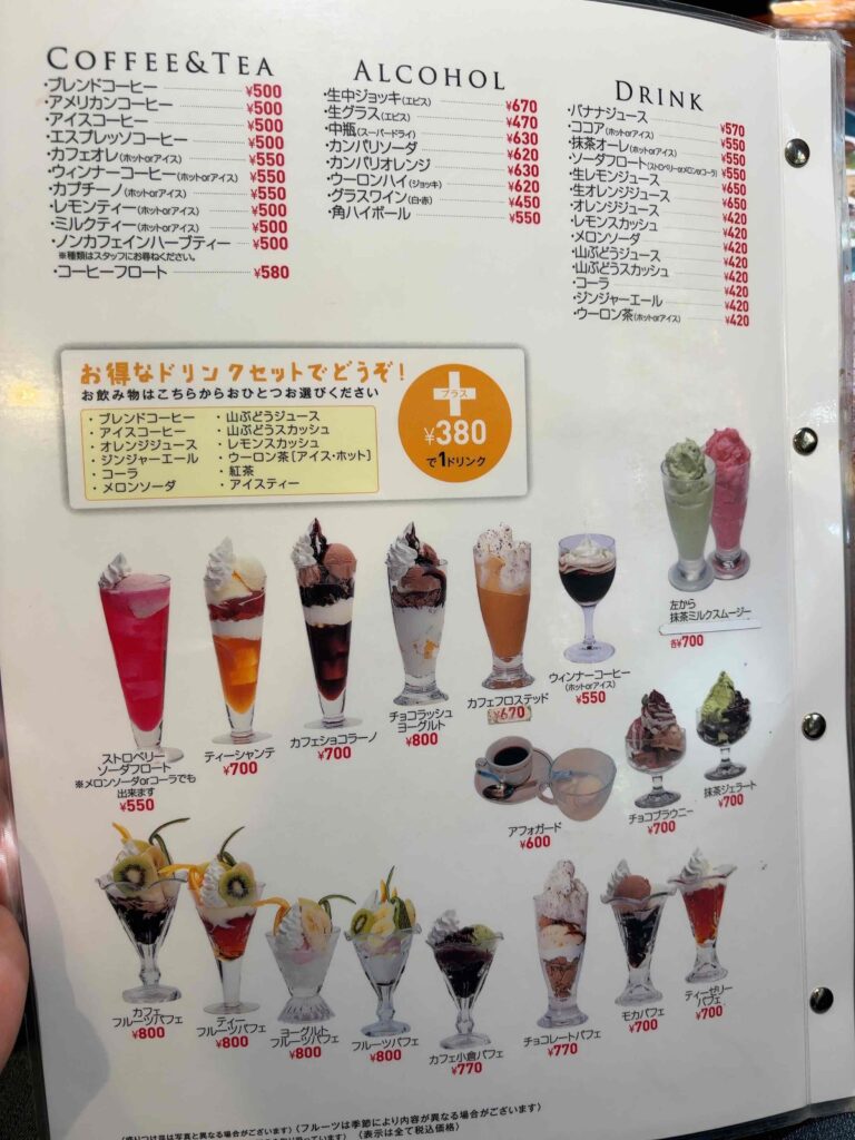 定番だけでなく、季節のフルーツを使った限定パフェや、ケーキなどのスイーツも用意されています。