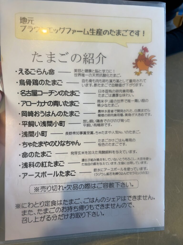 たとえば、上で紹介した「あさしな亭」で食べられる鶏卵は「ちゃたまや」という近くの販売所で手に入ります。